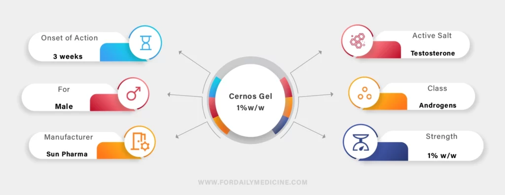 Cernos Gel 1%w/v includes testosterone, which is classified as an androgen. It is beneficial to those who do not have enough testosterone in their bodies. When the body’s testosterone levels are low, supplements are needed to meet the requirement. Cernos Gel 1%w/v can help increase the testosterone levels that have been depleted. Although testosterone is primarily a male sex hormone, it is also necessary for the development of female sexual organs. Cernos Gel 1%w/v is manufactured by Sun Pharmaceuticals, an Indian pharmaceutical firm. It is available in a 5 mg dosage that contains 1% testosterone by weight. Always consult your doctor about where the gel should be used; do not use it anywhere on the body, without consulting your doctor.